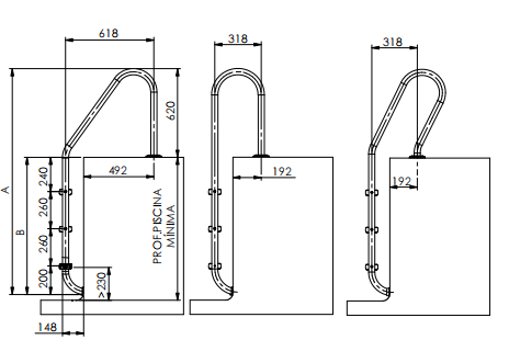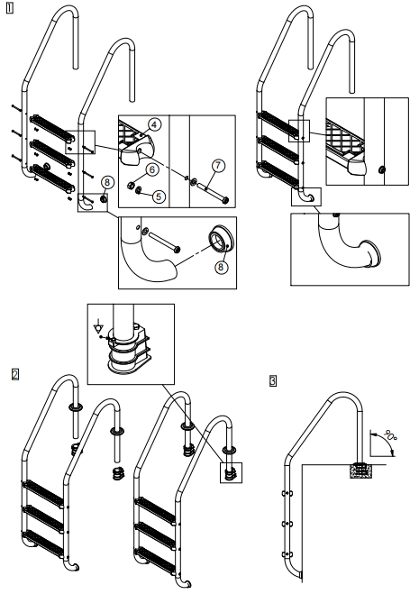 Échelles avec main courante modèle Standard, mural et mixte pour piscines enterrées. Tube Ø43 mm en acier inox poli. Marches en acier inoxydable. Livrées complètes avec ancrages de fixation prévus pour une liaison équipotentielle.